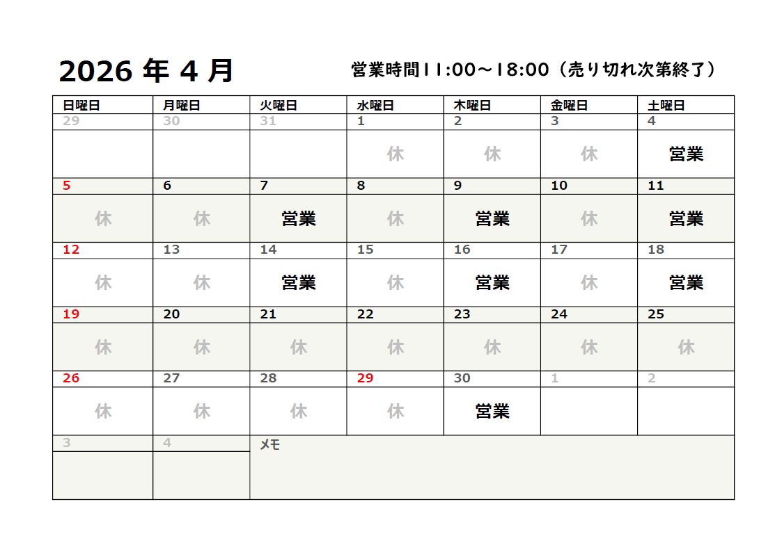 2026年4月営業カレンダー